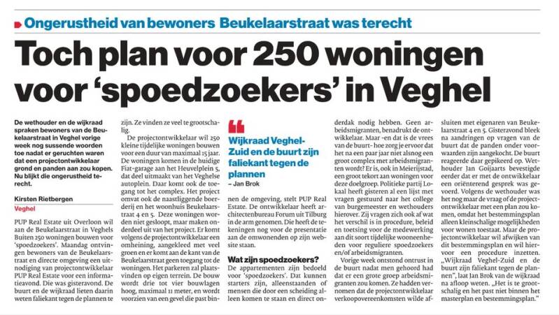 Op dinsdagavond 7 juli j.l. is een zogenaamde omgevingsdialoog georganiseerd door projectontwikkelaar PUP Real Estate om buurtbewoners in te lichten over een nieuw plan om 250 tijdelijke woningen te plaatsen. Deze woningen, bedoeld voor 'spoedzoekers' zouden gebouwd gaan worden op de locatie van de FIAT garage aan het Heuvelplein en de naastgelegen woningen aan de Beukelaarstraat.